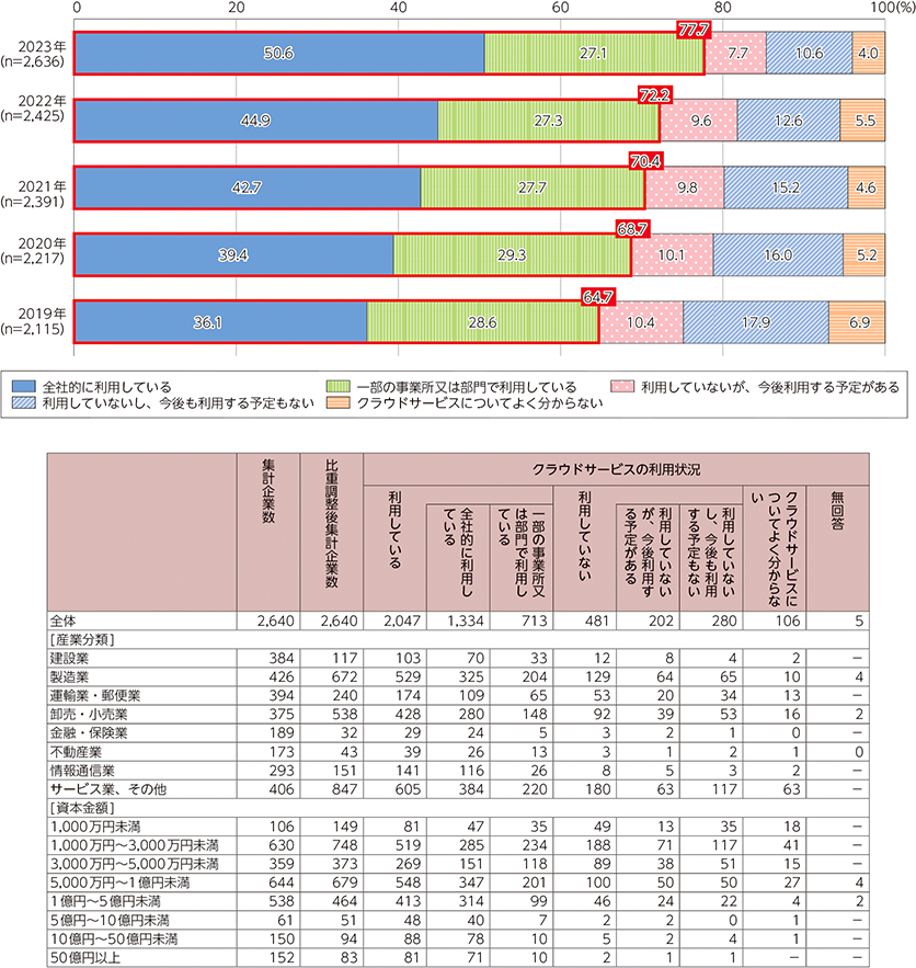 2023年の調査によると、全社的にクラウドサービスを利用している企業は50.6%と過去最高を記録しました。2022年の44.9%から大きく増加しており、クラウドサービスの普及が加速していることがわかります。また、一部の事業所や部門で利用している企業も27.1%と、全体の77.7%が何らかの形でクラウドを活用しています。